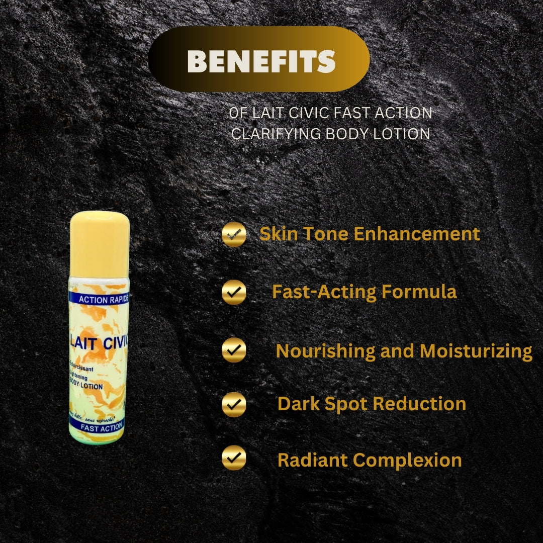 Enhance your natural skin tone with Lait Civic Fast Action Clarifying Body Lotion. Specially formulated to lighten and even out skin tone, this lotion nourishes and moisturizes while reducing the appearance of dark spots and discoloration. With consistent use, say hello to a brighter, more radiant complexion.