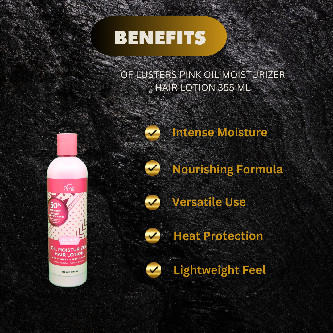 Enriched with essential oils and vitamins, Lusters Pink Oil Moisturizer Hair lotion improves hair's moisture and hydration, leading to smoother, healthier strands. This 355 ml lotion nourishes and strengthens hair, making it more manageable and eliminating dryness and breakage. Suitable for all hair types.
