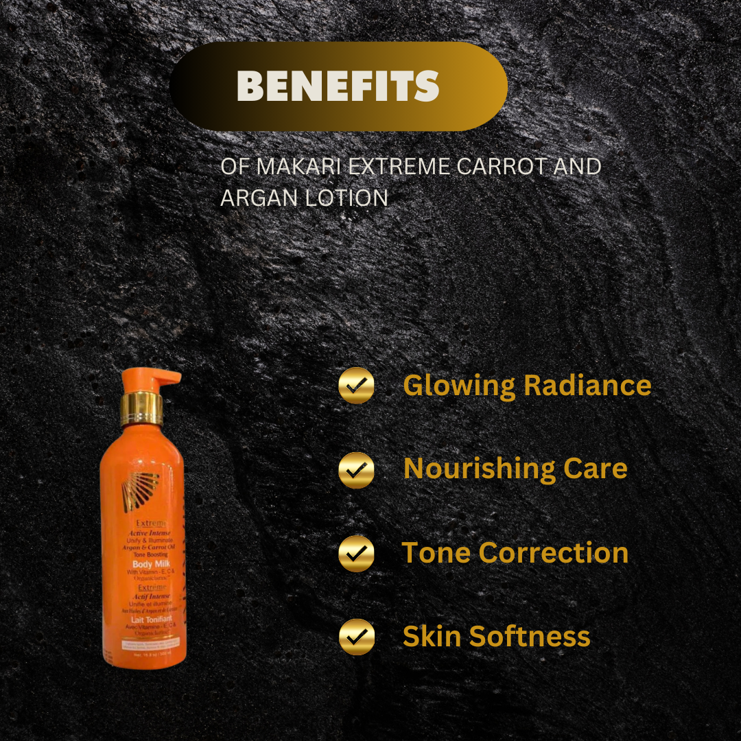 Makari Extreme Carrot and Argan Lotion - 16.8 / 500ml Makari Extreme Lotion with argan and carrot oil contains natural vitamins and glycerin’s. The natural oils lighten the skin complexion without damaging your skin. It leaves the skin tone clear and healthy.