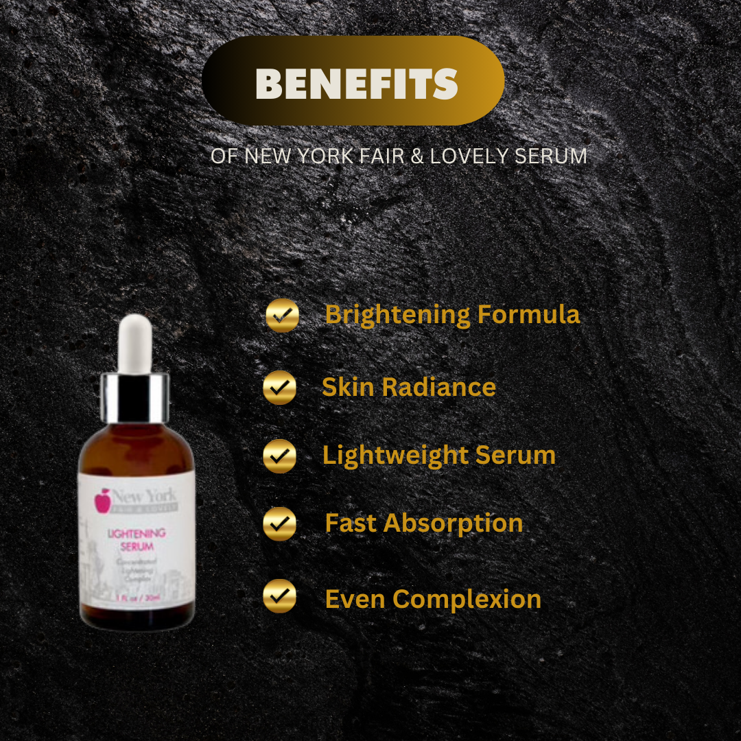 New York Fair & Lovely Serum 1 Oz Aggressively evens out skin tone, reducing skin discoloration. Vitamin “A” softens and smooths skin texture. Follow up with minimum SPF 30 Sun protection daily during and after order to prevent skin discoloration. Directions: Apply to cleansed dry skin, preferably at night. Let dry.