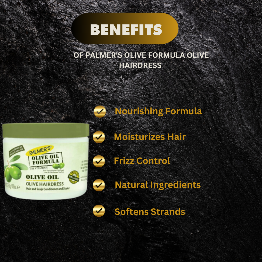 "Nourish and style your hair with Palmer's Olive Oil Formula Olive Hairdress. Infused with olive oil, this lightweight formula adds shine and softness to your locks. Perfect for everyday use, this 8.8 oz hairdress will leave your hair looking healthier and more vibrant."