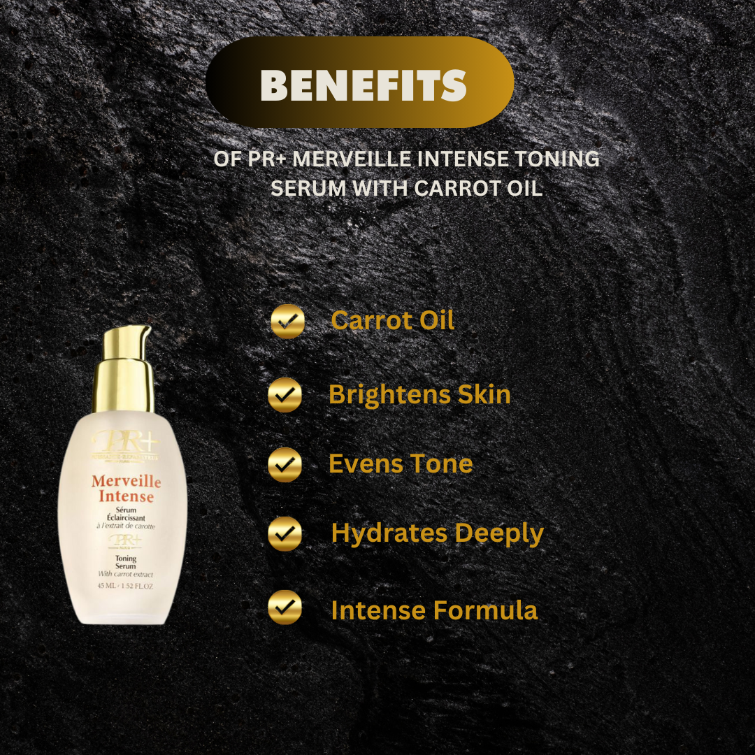 PR+ Merveille Intense Serum is a 100% natural toning care with vitamins and Carrot Extract, specially developed for black skins. It fights against the most resistant marks because of its strong actives.