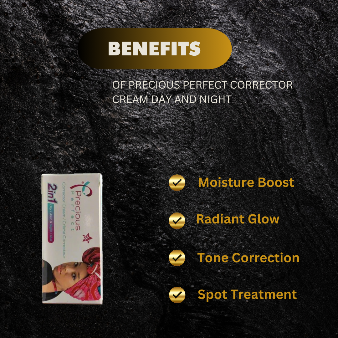 - Precious Perfect Corrector Cream Day and Night is a premium skincare product designed to reduce the appearance of dark spots and hyperpigmentation.