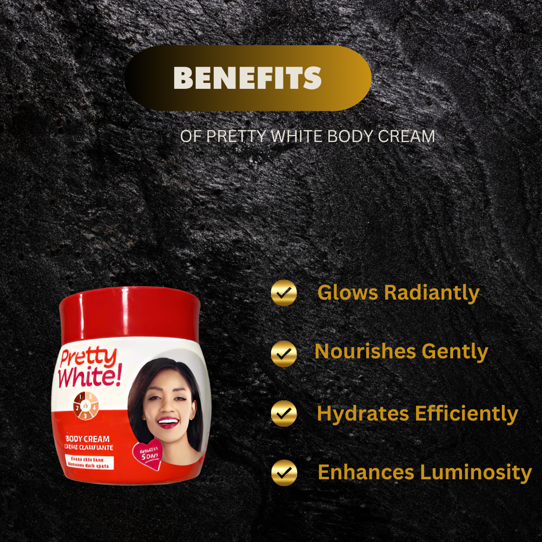 - Pretty White Body Cream is a premium skincare product designed to deeply moisturize and nourish your skin.