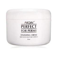 Razac Perfect for Perms Finishing Creme 8 oz Daily hairdressing & scalp conditioner with keratin. Stylist approved. Finishing Creme is a special blend of oils and protein combined to give hair a visible sheen, a healthier look and balanced conditioning. It's a daily dressing that's light so not to weight hair down. Hair is flammable. Keep hair away from heat, open flame, fire or sparks. Do not use while smoking. Avoid contact with eyes. If this occurs rinse thoroughly. Keep out of reach of children. If swallowed get help or contact a Poison Control Center immediately. 8 oz (236 g) 25 Brenner Street Newark, NJ 07108 800-600-1022 1995 Razac Products Razac "Perfect for perms" Finishing Creme is a special blend of essential oils and proteins combined to give hair a visible sheen, a healthier look, and balanced conditioning. It's a daily dressing that's "light" so not to weigh hair down.
