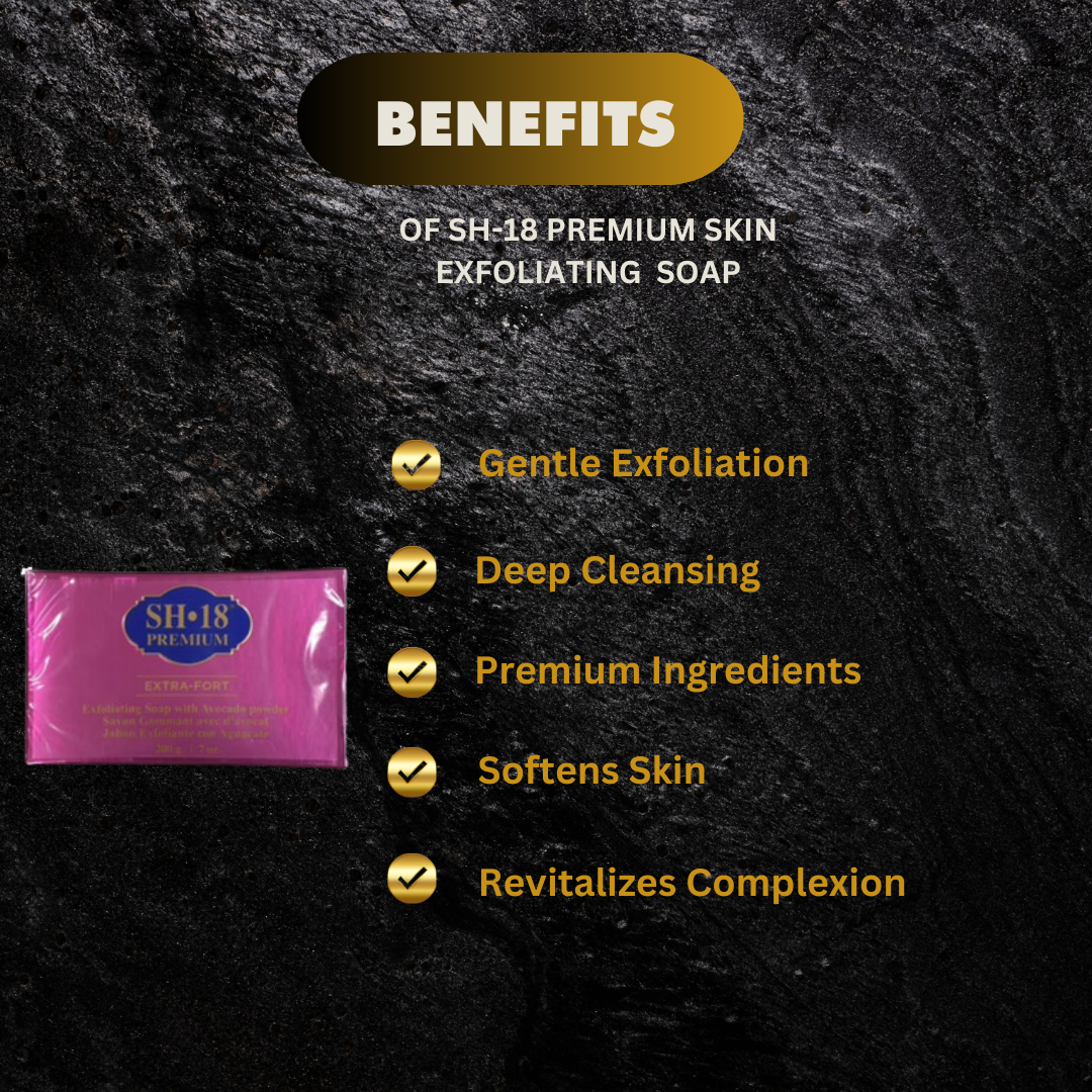 - SH-18 Premium Exfoliating Soap is a gentle yet effective formula designed to cleanse and exfoliate your skin.