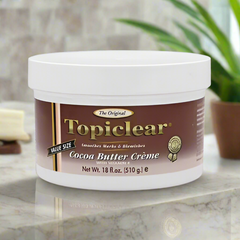 Topiclear Cocoa Butter Creme 18 oz Topiclear Cocoa Butter Creme smoothes marks & blemishes. Topiclear Cocoa Butter is fortified with a special blend of Vitamin A & E and enriched with the essential fatty acid, GLA found in Evening Primrose Oil to soften and moisturize rough, dry skin. It also helps smooth stretch marks, scars and blemishes. and improves the skin's overall appearance through revitalized skin tone and complexion.