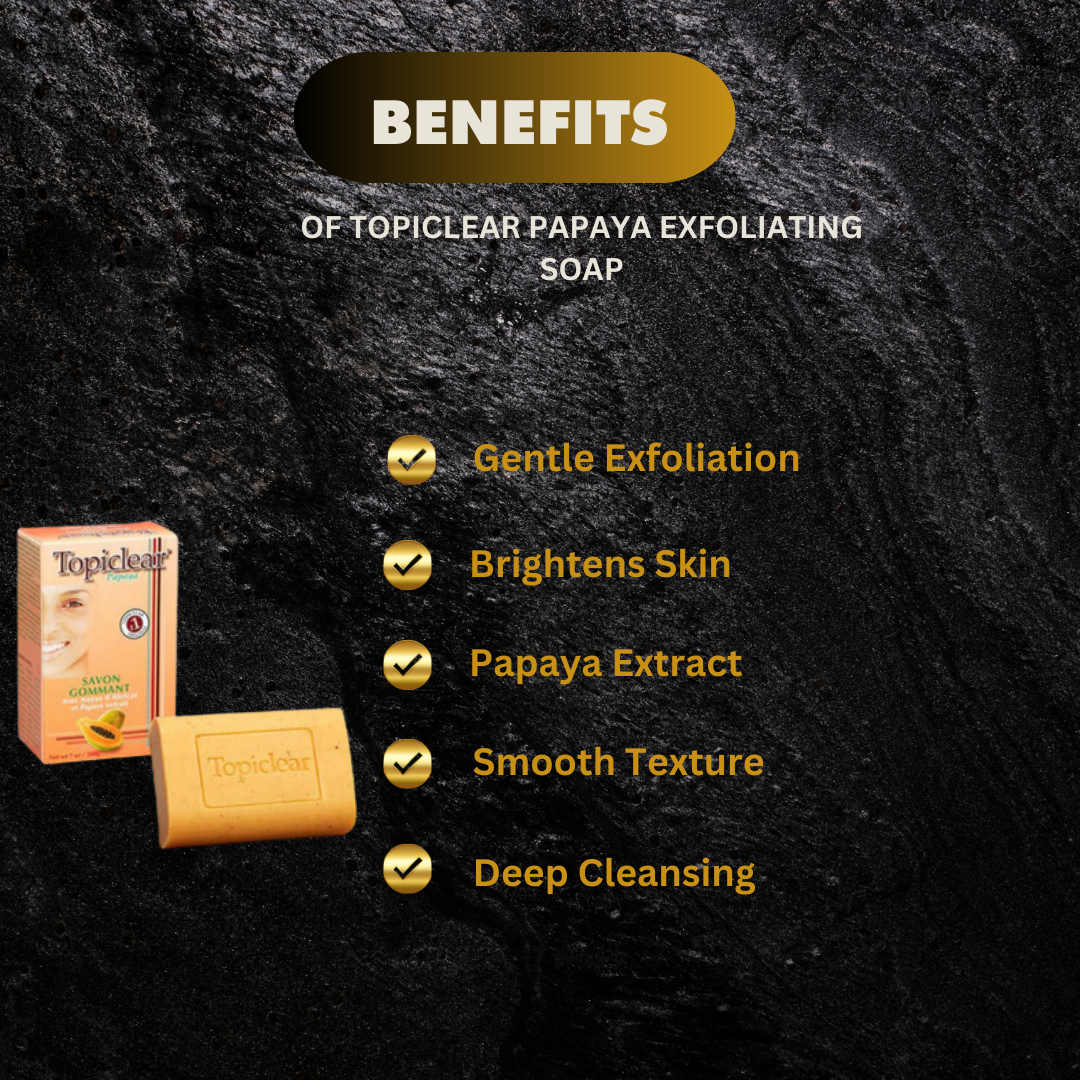 - Topiclear Papaya Exfoliating Soap is a skin exfoliating soap that contains apricot seed powder and papaya extract.