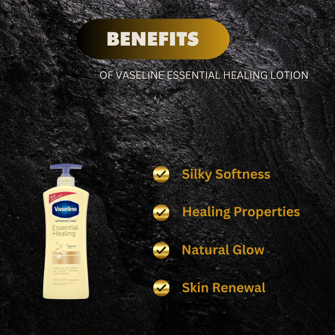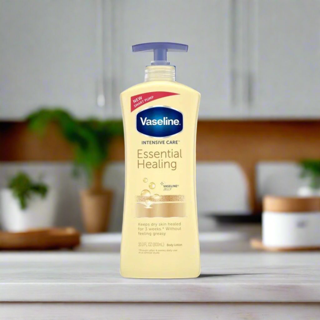 - Vaseline Essential Healing Lotion 600ml/20.3oz is to apply a small amount to dry skin and massage in gently.