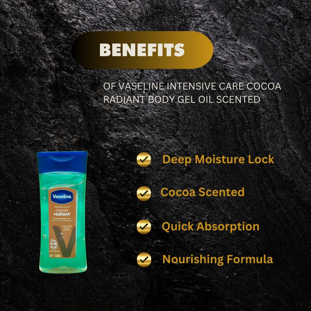 This cocoa-scented body gel oil is perfect for moisturizing dry skin. It absorbs quickly and leaves skin feeling soft and smooth. Made with pure cocoa butter and micro-droplets of Vaseline jelly, it helps to heal and nourish skin, revealing a radiant glow.