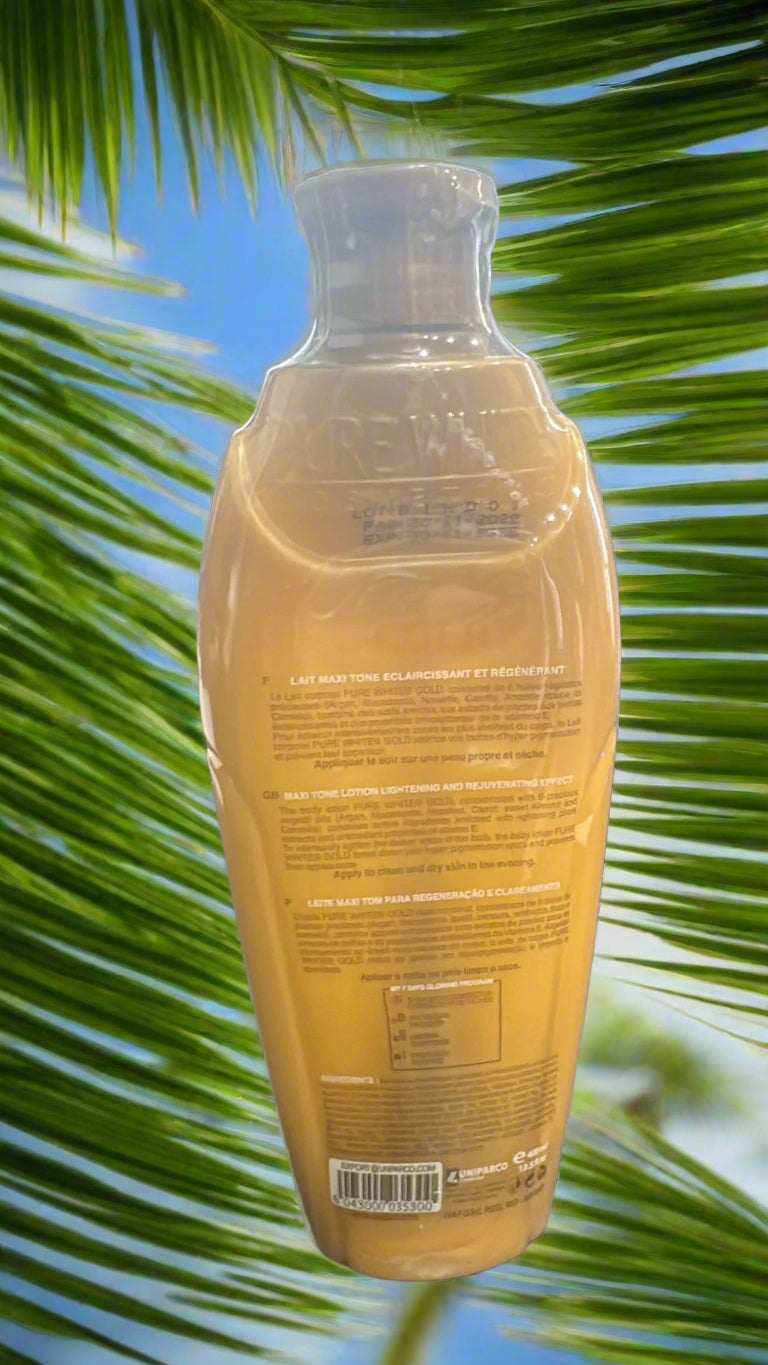 - Apply Pure White 2 Gold Glowing Even Tone Maxi Tone Lotion to clean, dry skin, and massage gently until fully absorbed.