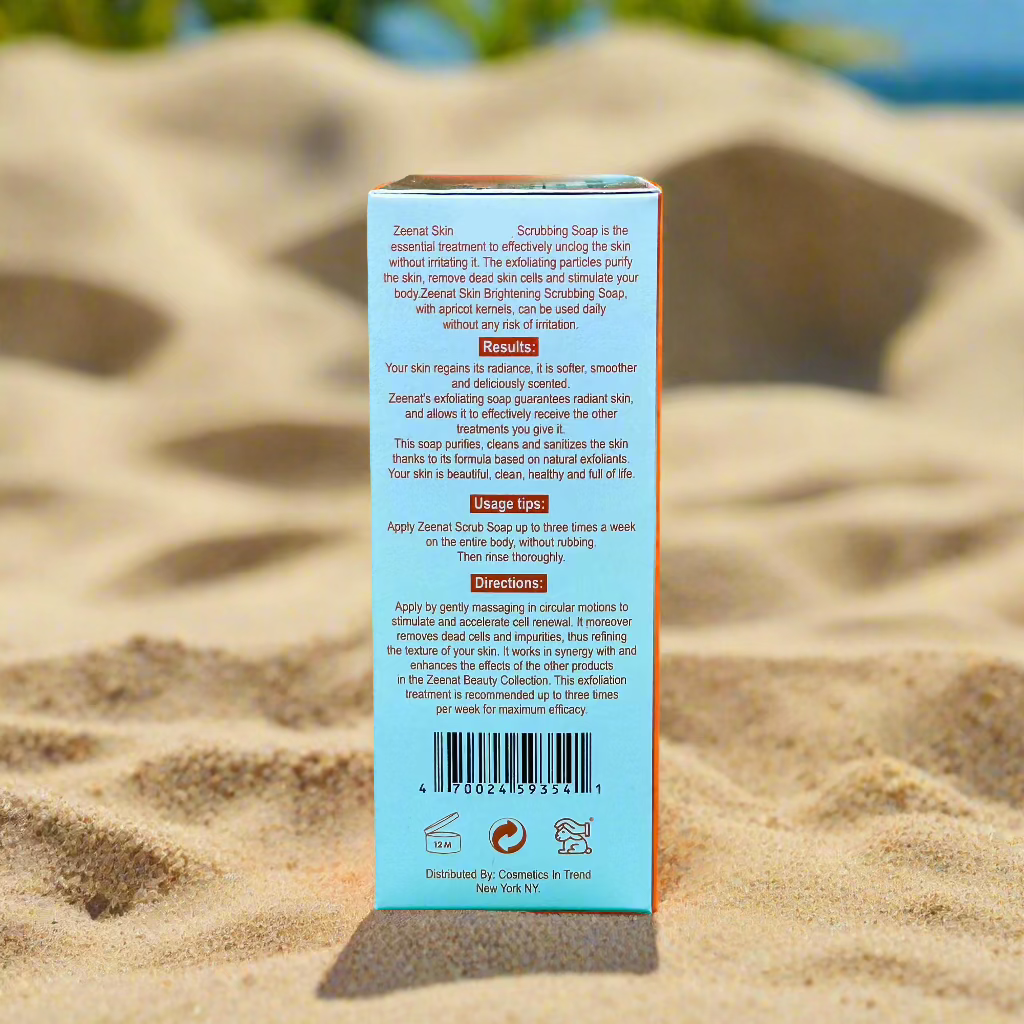 Zeenat Skin Scrubbing Soap is the essential to effectively unclog the skin without irritating it. The exfoliating particles purify the skin, remove dead skin cells and stimulate your body. Zeenat Skin Scrubbing Soap, with apricot kernels, can be used daily without any risk of irritation.